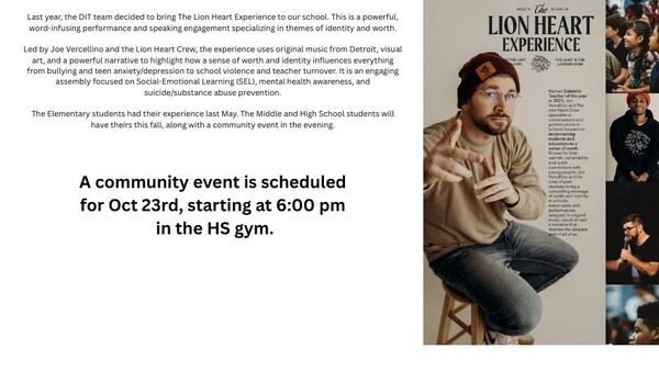 A community event is scheduled for Thursday, October 23rd, at 6 pm in the HS Gym.